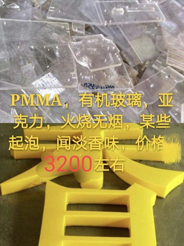 PMMA俗稱有機玻璃,回收價值較高,火燒白煙,有香味,某些起泡,燒起來啪啪啪響,放地上聲音沉悶,常見的發(fā)光字,麻將,精美擺件。