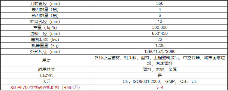 | XB-PF700立式破碎機價格(RMB:萬) | 歡迎來電咨詢 |