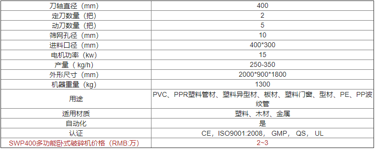 | SWP400多功能臥式破碎機(jī)價格(RMB:萬) | 歡迎來電咨詢 |