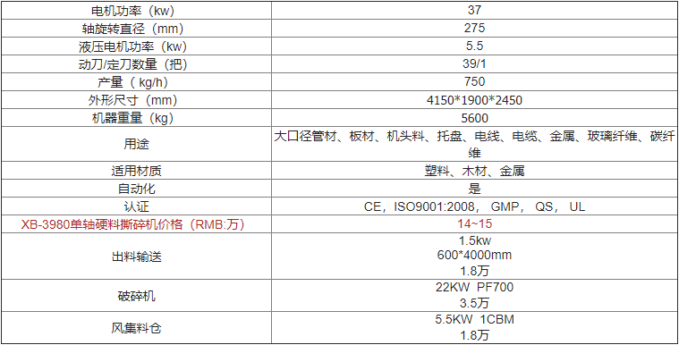 | XB-3980單軸硬料撕碎機(jī)價(jià)格(RMB:萬(wàn)) | 歡迎來(lái)電咨詢(xún) |