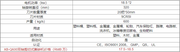 | XB-Q600雙軸剪切式撕碎機(jī)價(jià)格(RMB:萬) | 歡迎來電咨詢 |