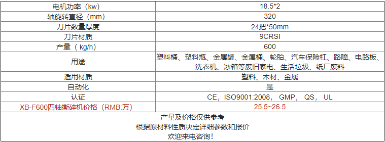 | XB-F600四軸撕碎機(jī)價(jià)格(RMB:萬) | 歡迎來電咨詢 |