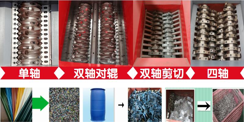 舉個(gè)例子,如果我需要將大口徑管道進(jìn)行撕碎處理,在市場上有的廠家推薦單軸撕碎機(jī)、有的廠家推薦雙軸撕碎機(jī),甚至還有推薦四軸撕碎機(jī)的,同時(shí)還有推薦破碎機(jī)就可以的。我們先用排除法解決,首先破碎機(jī)是肯定不行的,上面我們講了破碎機(jī)和撕碎機(jī)的結(jié)構(gòu)原理,大家已經(jīng)明白破碎機(jī)為什么不可以了。四軸撕碎機(jī)這種結(jié)構(gòu)主要適用于薄壁中空類容器,在這里也可以否定。剩下雙軸和單軸撕碎機(jī)做對(duì)比。雙軸撕碎機(jī)的驅(qū)動(dòng)方式是兩個(gè)電機(jī)兩根軸,工作原理是通過刀片與刀片之間旋轉(zhuǎn)咬合的方式將物料剪碎,這種方式必須是投進(jìn)去的物料是在電機(jī)扭力的承受范圍內(nèi)才可以剪碎,否則將會(huì)出現(xiàn)卡死,頻繁正反轉(zhuǎn)這種問題,大口徑管道通常硬度大,承載能力強(qiáng)。想用雙軸撕碎機(jī)將大口徑管道剪碎必須用很大的電機(jī)功率才能達(dá)到最佳的效果。單軸撕碎機(jī)的驅(qū)動(dòng)方式是單電機(jī)結(jié)構(gòu),工作原理是主軸旋轉(zhuǎn)后,通過油缸帶動(dòng)料倉將物料推進(jìn)到正在旋轉(zhuǎn)的主軸上,將物料撕碎的目的。同時(shí)通過電流控制物料和主軸接觸的面積,當(dāng)電流過高時(shí)料倉自動(dòng)后退將物料與主軸分離,該結(jié)構(gòu)方式具有電機(jī)功率小,使用靈活,不用考慮投進(jìn)去的物料多少主軸是否能夠適用的特點(diǎn)。完全是自動(dòng)化操作,達(dá)到節(jié)省能耗及人力成本。